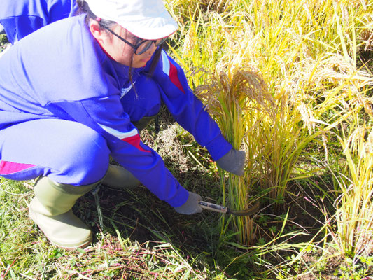その後、早速田んぼに入り、鎌で次々に刈っていきました。