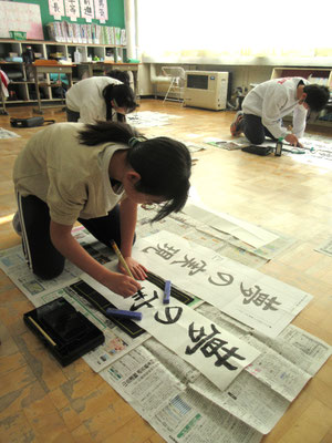6年生は、書き初めの練習をしていました。この体勢で書くのは非日常なので、ちょっと難しいです。