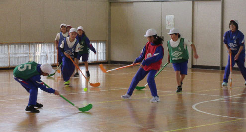 町内の小学生は、ユニホッケーの試合で交流しています。