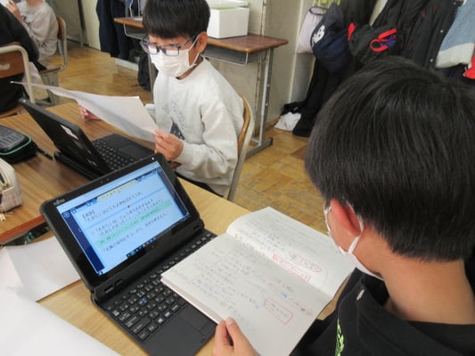 4年生は、山形県の伝統工芸品を調べて、そのよさを伝える文章を書いていました。デジタルとアナログが融合され、それぞれのよさを生かしていました。