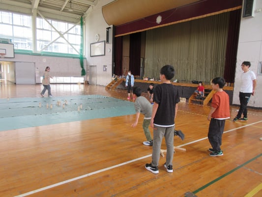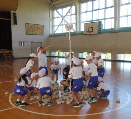 2校時、体育館では、低学年の体育の授業で、まり入れの練習が行われていました。