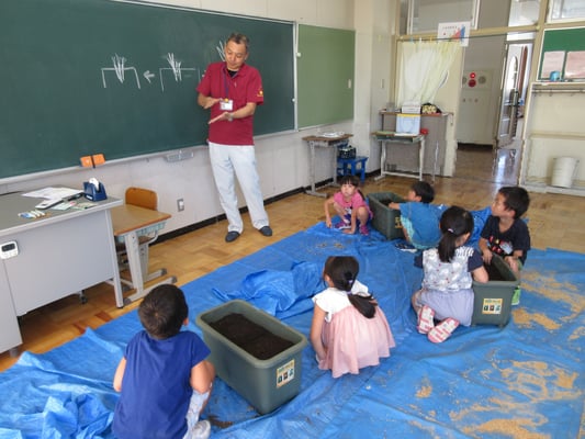 子どもたちは、6月に、給食で出た野菜の芯や皮を使った土づくりを体験しています。