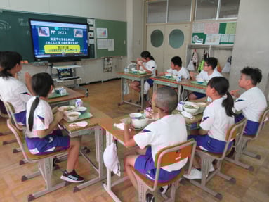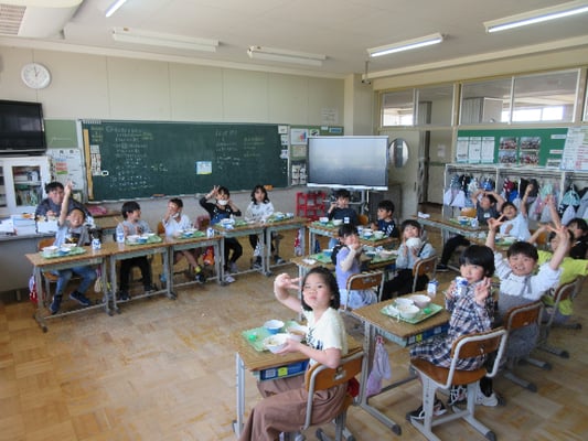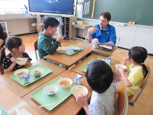 今日は2年生がアーロン先生とのランチタイムを楽しみました。3年教室では、座席を「つ」と「し」の形にして楽しく食べていま