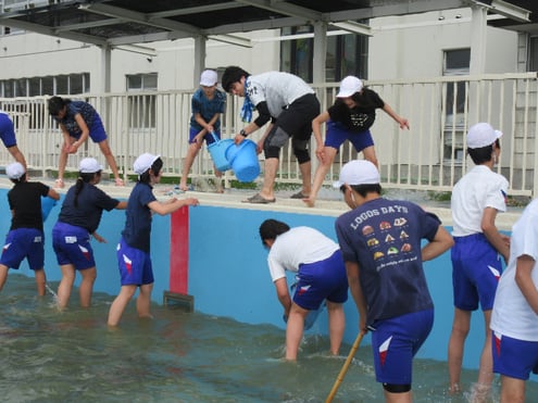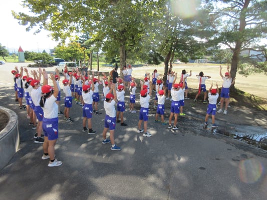 残暑が厳しい中での運動会練習。決して無理せず、健康第一で行います。