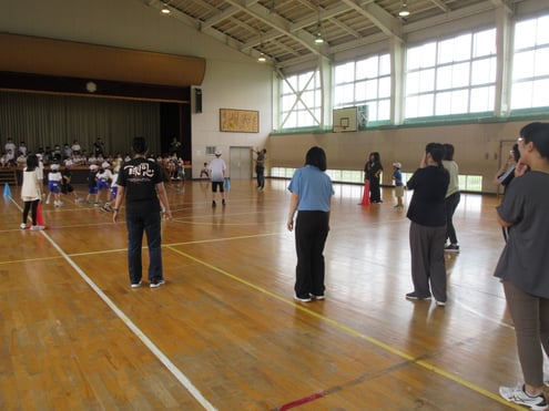 子どもたちは、助走の歩数、踏切、跳ぶ姿勢、着地など、ポイントを具体的に教わっていました。