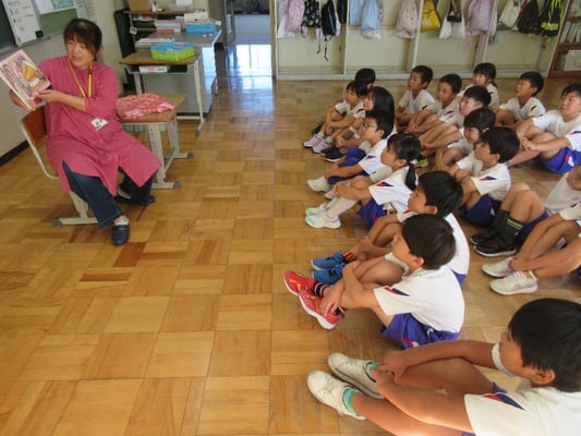 今日の朝の活動は読み語りでした。