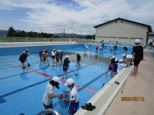 側溝の土砂上げ、校舎内のガラス磨きなど、